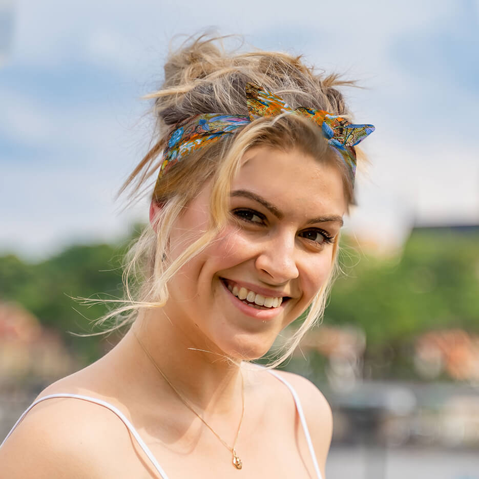 Šátek je vyroben ze saténu. V šátku je všit drátek pouze na jedné straně, pro dokonalou fixaci při úvazech na hlavě viz. video návody. Lze nosit na několik úvazů na hlavě, například šátek uvázaný do růže, mašličky, přeložené čelenky, nebo hladkou variantu s úvazem do zátylku. Můžete nosit uvázané i na krku, zápěstí. Šátek je odolný vodě, můžete se s ním koupat. Lze prát v ruce nebo pračce na jemné praní BEZ ŽDÍMÁNÍ. Lze žehlit.